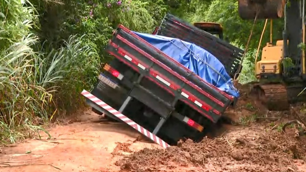 Por conta das chuvas dos últimos dias, a estrada de terra ficou enlamaçada, o que também provocou buracos na via. O caminhão estava carregado com 11 toneladas de aço e foi resgatado por uma retroescavadeira.