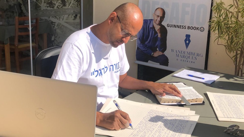 Wandemberg Marques, de 52 anos, completa um mês da tentativa de se tornar a pessoa mais rápida do mundo a copiar a Bíblia nesta quarta-feira (16). O empresário iniciou o desafio em um hotel na estância de Lindoia no dia 16 de maio. Com uma média diária de 15 páginas escritas por dia, Wandemberg deseja terminar de copiar o livro sagrado em 1 mil horas.