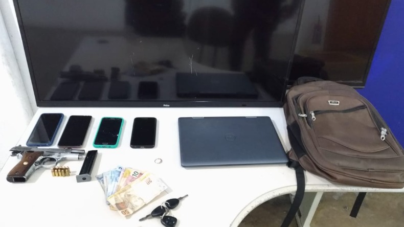 Após ordem de parada e perseguição, três homens abandonaram o veículo e saíram em fuga, sendo que um deles foi detido em seguida. Com o detido, foi encontrada uma pistola com 10 munições e numeração raspada. Dentro do veículo, a polícia encontrou duas televisões, um notebook, quatro celulares, além de R$ 140 e um anel.